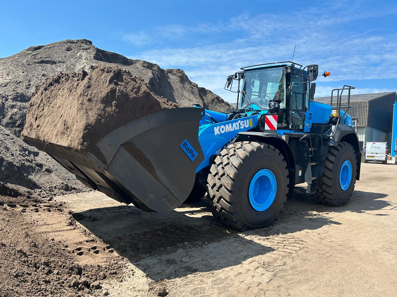 De nieuwe 20 tons Komatsu laadschop zal ingezet gaan worden voor het uitvoeren van op- en overslagwerkzaamheden in “agressieve” producten welke een standaard machine op korte termijn zouden aantasten. Hierbij te denken aan het op- en overslaan van kunstmest, fosfaten en zout.